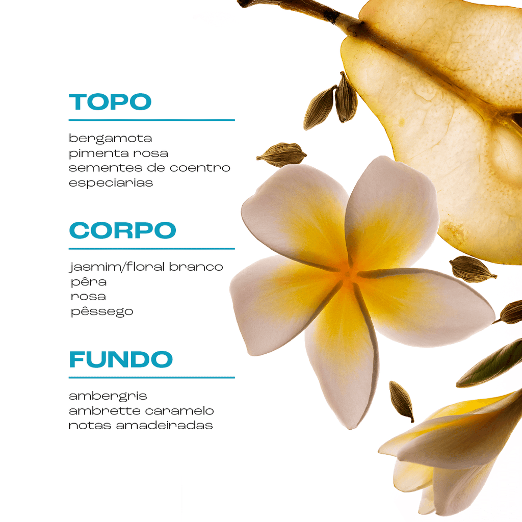 Uma composição vibrante que combina os ingredientes de maneira inédita. A união do coentro e da bergamota no topo trazem o frescor de uma brisa de verão em um dia quente, e preparam os seus sentidos para a carga eletrizante da pimenta rosa e das especiarias, que se contrapõem as notas de coração, as quais trazem uma apaziguadora combinação floral frutada, revelando uma dualidade intrigante entre a intensidade e a suavidade. Por fim, como um abraço caloroso, surgem as notas de fundo embaladas pelo caramelo, o ambergris e as notas amadeiradas.