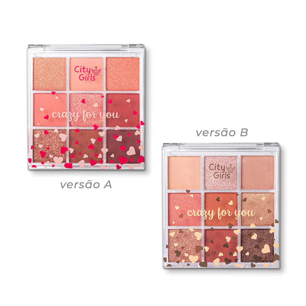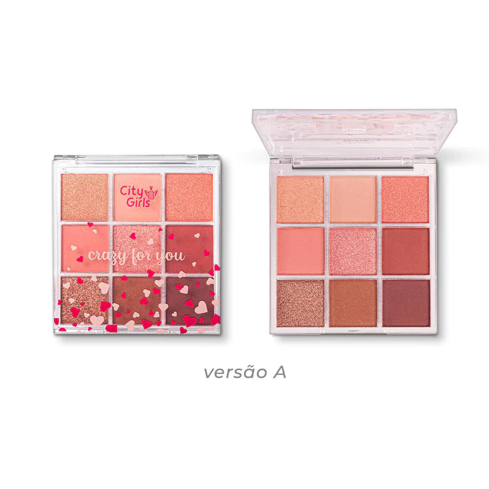 Às vezes tudo o que precisamos é de uma maquiagem mais leve para dar aquele up no nosso dia a dia, né? Para isso, você pode contar com a Crazy For You, uma paleta de sombras que possui 9 tons muito usáveis e românticos, que proporcionam um esfumado mais leve para você se sentir linda e poderosa, com uma maquiagem que realça sua beleza natural! Nela, você encontra diversos tipos de acabamentos, desde sombras matte e matte com micropartículas de brilho, além das brilhosas, como shimmers e cintilantes! Todas entregam pigmentação, facilidade no esfumado e muita durabilidade para aguentar qualquer imprevisto do seu dia! A paleta possui uma embalagem compacta e transparente, com corações fofos que vão te deixar realmente doidinha pela beleza dessa paleta e também a sua, é claro! Disponível nas versões A e B.